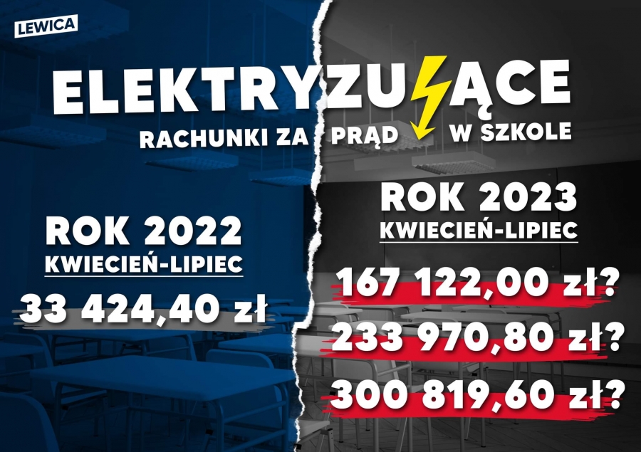 Polityk zaprezentował grafikę, na której przedstawił dotychczasowe opłaty za energię, jakie ponosi placówka edukacyjna, oraz przewidywane koszty, które poniesie od przyszłego roku. Jak się okazuje, koszty te mogą być wyższe nawet dziesięciokrotnie, a szkoła zamiast 30 000 zł, będzie musiała płacić 300 000 zł za sam prąd. Sytuacja taka nie jest niemożliwa, co pokazuje przykład przytoczony przez parlamentarzystę Lewicy, który wspomniał o podwyżce opłat za energię w Piotrkowie Trybunalskim, gdzie wyniosła ona 1000%.